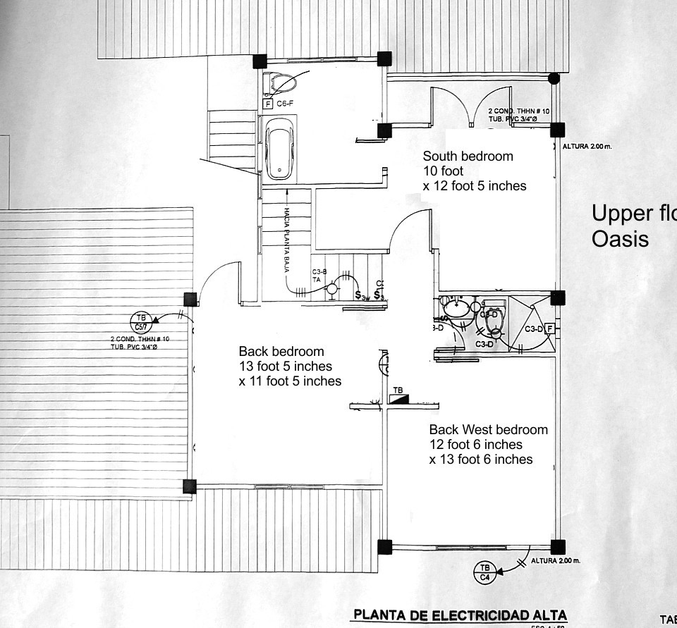 The upper floor has two bathrooms and three bedrooms, One bedroom could become the kitchen dining area. There is access to the concrete roof and a further sun deck could be made there.